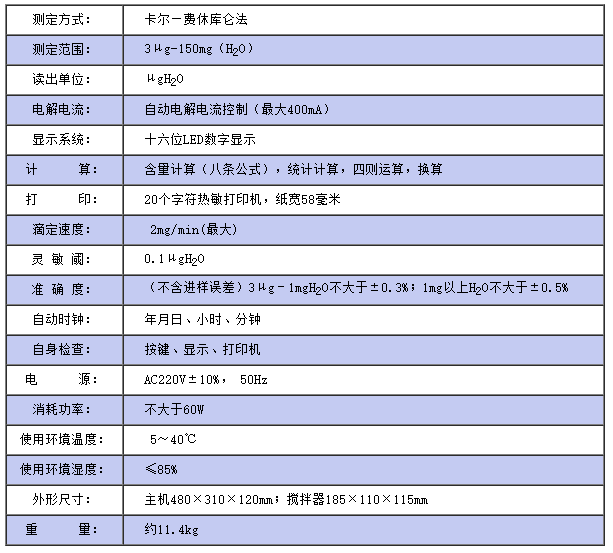 儀器符合GB/T7600;SH/T0246;GB/T606及采用卡爾—費(fèi)休法測定樣品中水分的有關(guān)標(biāo)準(zhǔn)。 儀器采用了先進(jìn)的自動控制電路,電解電流自動跟蹤控制,外型結(jié)構(gòu)新穎,從而使該儀器工作更可靠,使用更方便,具有分析速度快(一分鐘出結(jié)果)、操作簡便、精度高、自動性強(qiáng)等特點(diǎn),同時(shí)具有自動打印功能,可將實(shí)驗(yàn)結(jié)果、做樣時(shí)間、樣品編號自動打印出來,廣泛應(yīng)用于石油、化工、電力、鐵路、環(huán)保等部門。